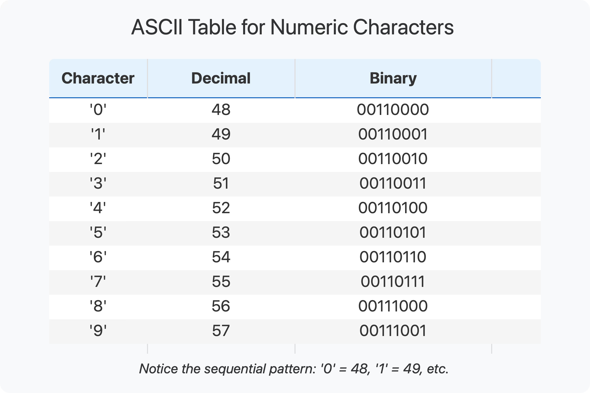 This simple pattern holds true for all numeric digits in ASCII, and it's the foundation of string-to-number conversion.
