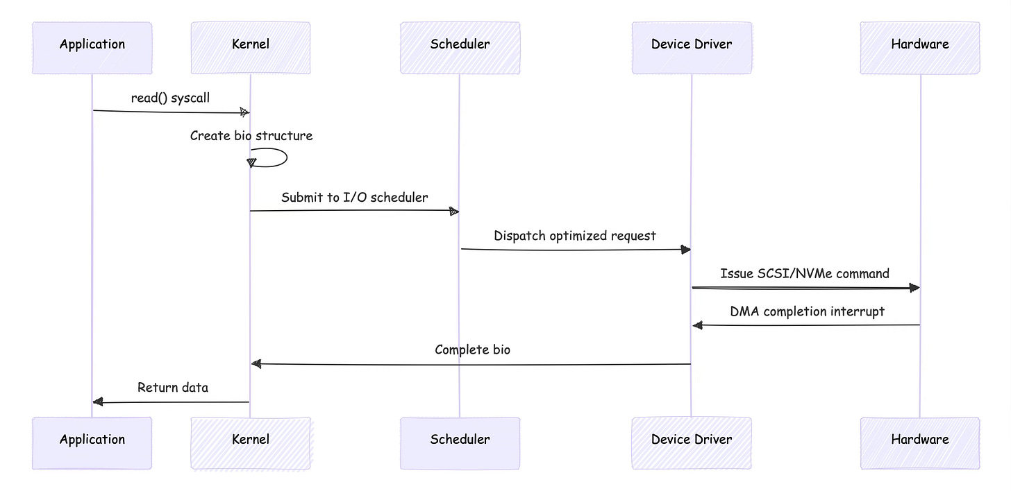 This layered architecture means that file I/O performance depends on multiple components. A slow read()