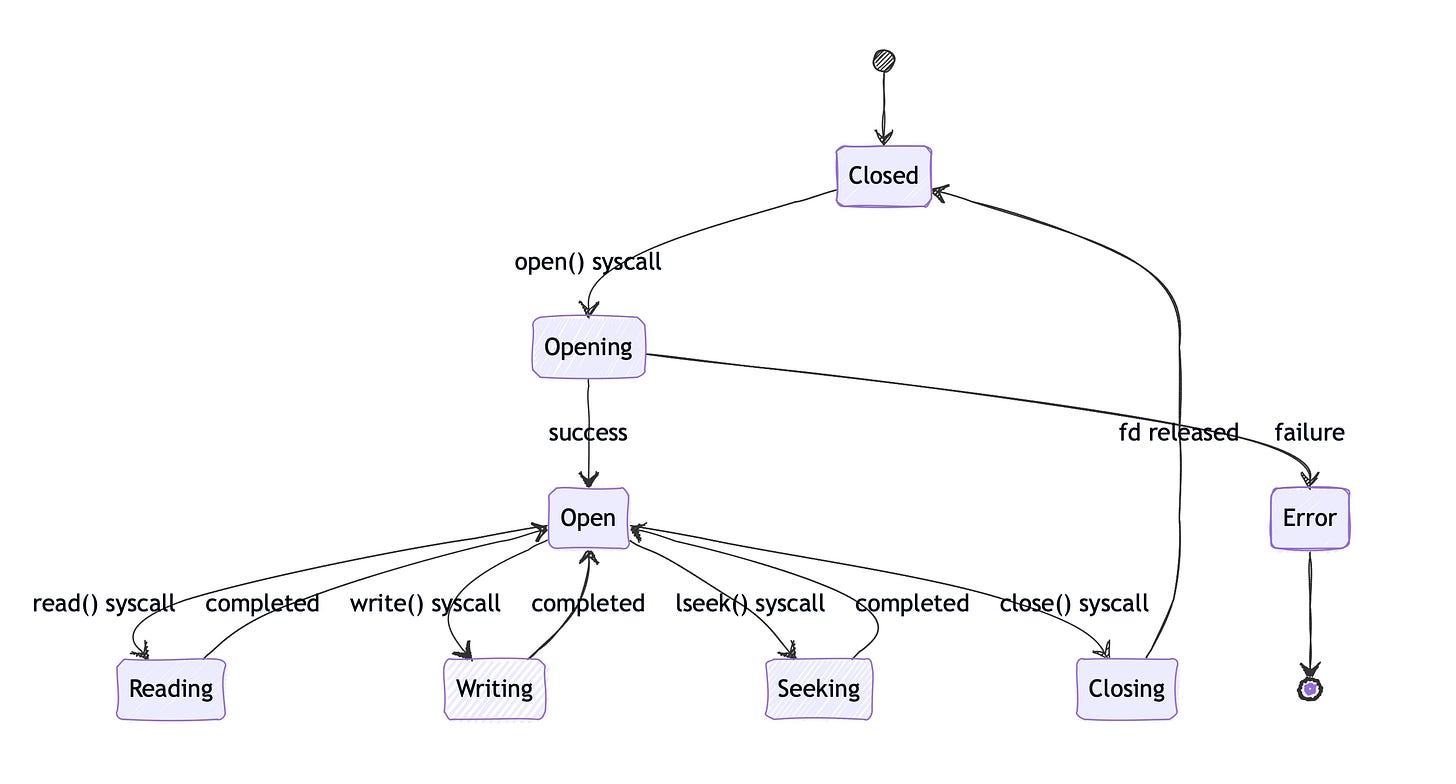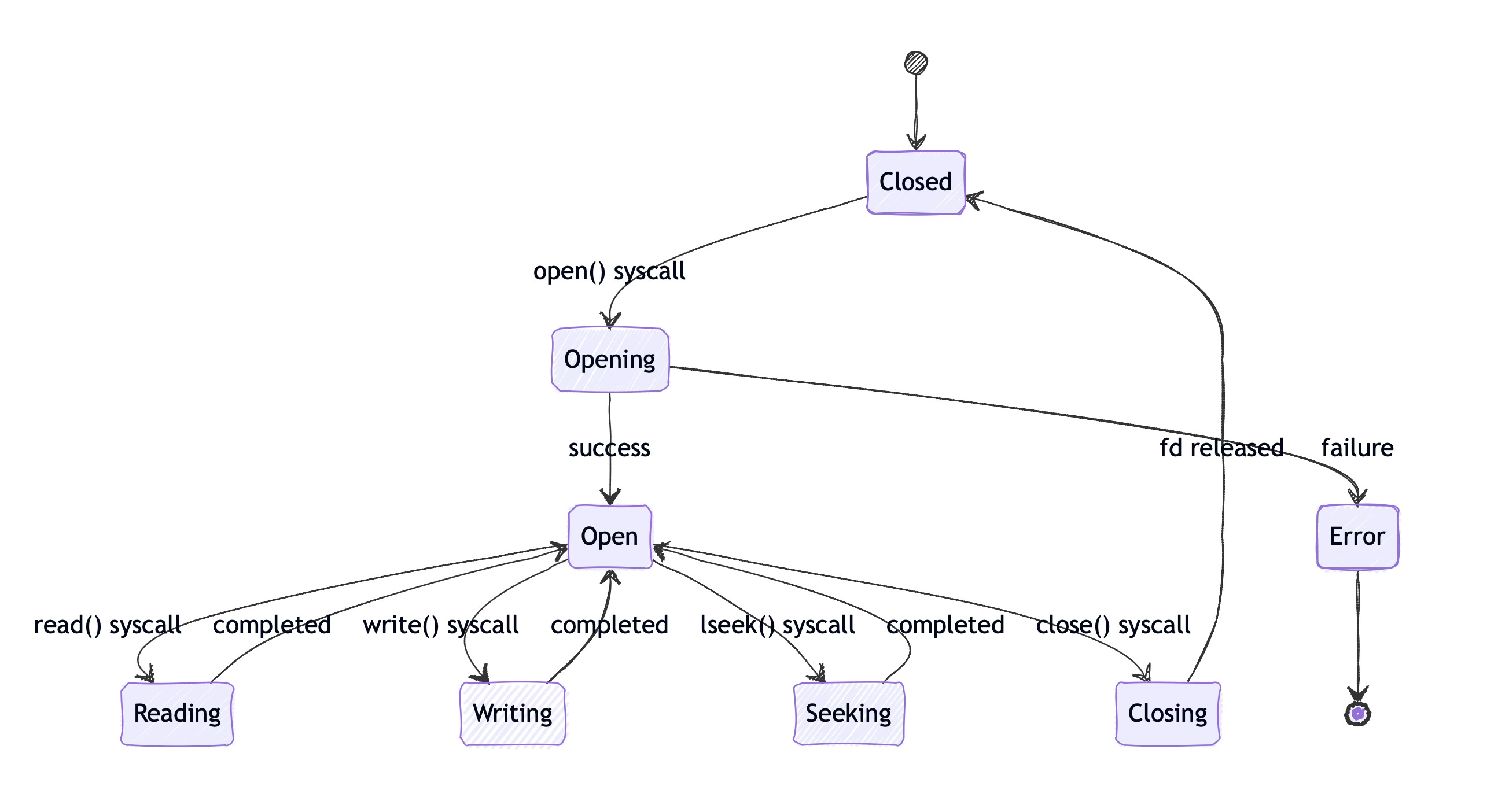 Above diagram shows how file descriptors transition through their lifecycle. Each transition involves kernel code that validates permissions, updates data structures, and potentially triggers I/O operations to storage devices.