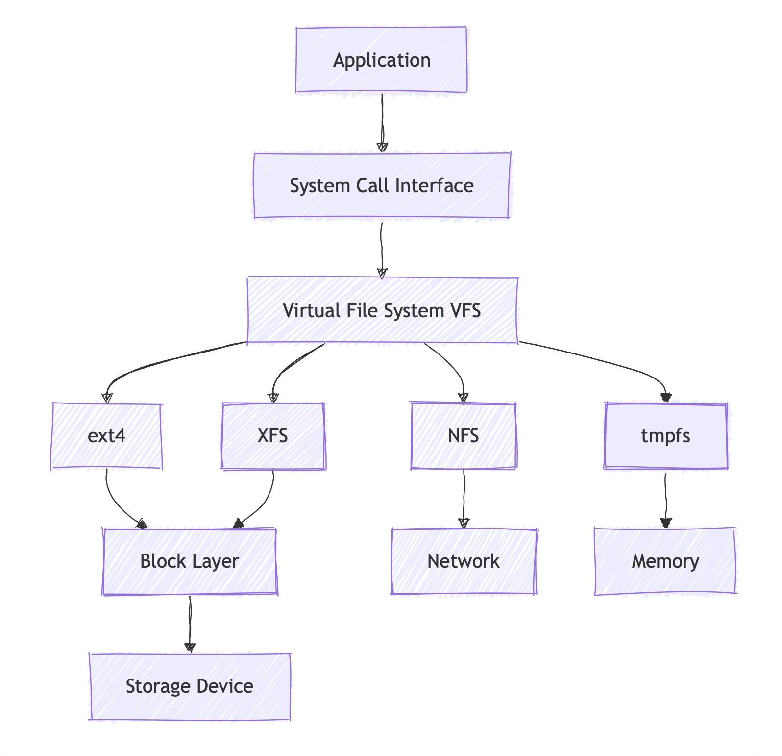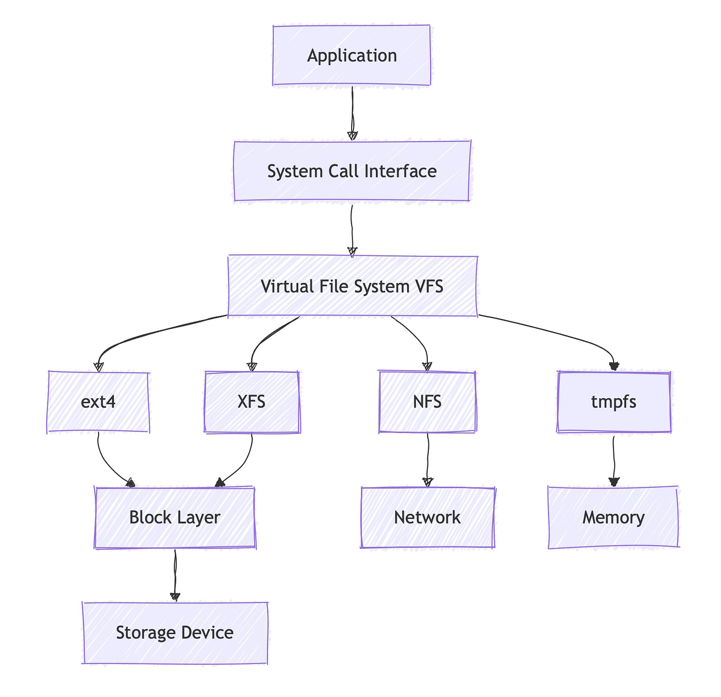The VFS (Virtual File System) sits between your syscalls and the actual file system implementation. It provides a common interface that allows the same read()
