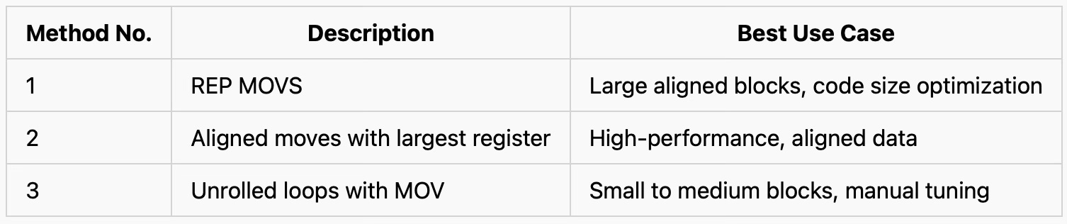 In x86 assembly, you can't directly move data between two memory addresses with mov due to encoding limitations, but you can use a register as an intermediate for small data or leverage movs with rep for blocks. Understanding these methods, along with optimization tips like alignment, is key to writing efficient assembly code.